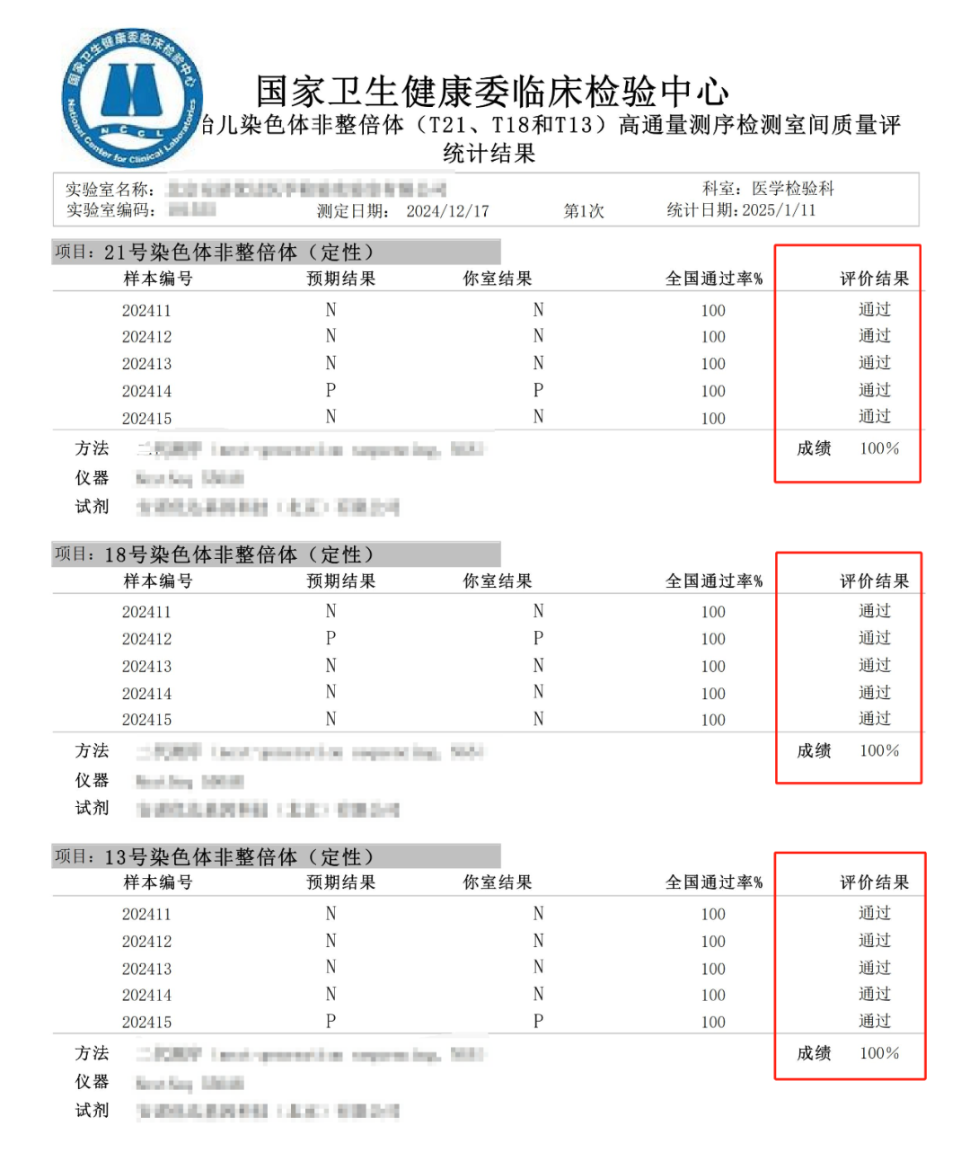 安诺优达医学检验实验室再次满分通过外周血胎儿染色体非整倍体(T21,T18和T13)高通量测序检测室间质评